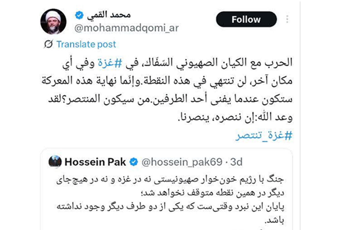رئیس سازمان تبلیغات اسلامی همزمان با اعلام خبر آتشبس در غزه، توئیتی به زبان عربی منتشر کرد که بازنشر پست حسین پاک، فعال حوزه مقاومت در شبکه اجتماعی ایکس بود. حجتالاسلام قمی در این توئیت تاکید کرد؛ جنگ با رژیم خونخوار صهیونیستی نه در غزه و نه در هیچجای دیگر در همین نقطه متوقف نخواهد شد.
