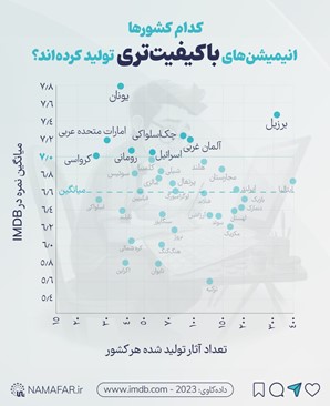 طبق آمارهای منتشر شده: آمریکا با ۶۵۰۰ پویانمایی، ژاپن با ۴۰۰۰، انگلیس با ۱۰۰۰، کانادا با ۹۵۰ و فرانسه با ۹۰۰ تولید در صدر جدول تولیدکنندگان این صنعت قرار دارند. اما اگر پای کیفیت به میان بیاید، نتیجه متفاوت است؛ میانگین امتیازهای ثبتشده در IMDb نشان میدهد که برخی از بهترین پویانماییها لزوماً محصول همین غولهای تولید نیستند. در عوض، کشورهایی مانند یونان، برزیل، امارات، چکاسلواکی و حتی آلمان غربی در میان تولیدکنندگان باکیفیتترین آثار دنیا قرار گرفتهاند.