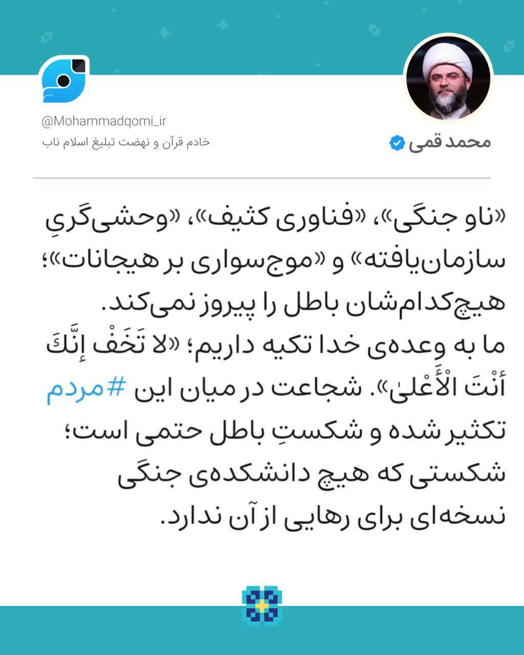 «ناو جنگی»، «فناوری کثیف»، «وحشیگریِ سازمانیافته» و «موجسواری بر هیجانات»؛هیچکدامشان باطل را پیروز نمیکند. ما به وعدهی خدا تکیه داریم؛ «لا تَخَفْ إنَّكَ أنْتَ الْأَعْلىٰ». شجاعت در میان این مردم تکثیر شده و شکستِ باطل حتمی است؛ شکستی که هیچ دانشکدهی جنگی نسخهای برای رهایی از آن ندارد.