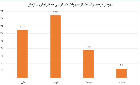 نتایج حاصل از سوال "سهولت دسترسی به تارنما (سرعت بارگذاری صفحات، کاربرپسند بودن، رابط گرافیکی، دستهبندی موضوعی) را چگونه ارزیابی میکنید؟" رضایت بیش از دو سوم کاربران و بازدیدکنندگان تارنمای سازمان را نسبت به سهولت دسترسی به محتوای آن نشان میدهد. با توجه به اعمال دستورالعملهای مرتبط با استانداردها و الزامات تارنماهای دستگاههای اجرایی تارنمای سازمان غالب امتیازات مرتبط با شاخصهای ارزیابی تارنما را به لحاظ ساختاری و محتوایی دریافت کرده است.