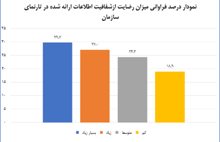 آمار دریافتی از سوال " میزان رضايت مندي خود از شفافيت اطلاعات ارائه شده در سايت سازمان تبلیغات اسلامی را اعلام نمایید." حاکی از رضایت نسبی کاربران در میزان شفافیت اطلاعات ارائه شده در تارنمای سازمان میباشد. با توجه به الزامات نهادهای ارزیاب در خصوص وجود شفافیت در اطلاعات ارائه شده، تارنمای دستگاه اطلاعاتی از قبیل بیانیه مأموریت سازمان، گزارش ارائه خدمات الکترونیک، استراتژیها و سیاستهای دستگاه در حوزه دولت الکترونیکی، اطلاعات مناقصات و مزایدات دولتی، و بیانیه حفظ حریم خصوص و مالکیت معنوی را به صورت شفاف در اختیار مخاطبین خود قرار داده است.