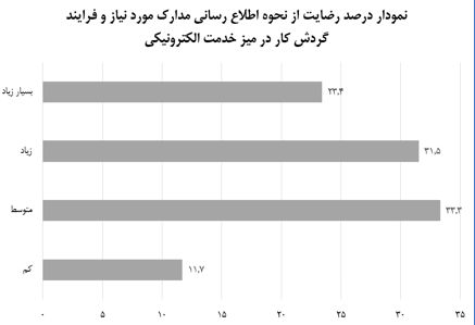 گزارش حاصل از سوال "چقدر از نحوه اطلاع رسانی مدارک مورد نیاز و فرایند گردش کار در میز خدمت الکترونیکی رضایت دارید؟" نشان میدهد که رضایتمندی نسبتی در حوزه اطلاعرسانی مدارک مورد نیاز و فرایند گردش کار از نگاه متقاضیان خدمات سازمان وجود دارد. در راستای تسهیل در فرایند دریافت درخواست و ارائه خدمات و براساس دستورالعملهای ارائه شده، حذف دریافت مدارک فیزیکی در خدمات الکترونیک سازمان و همچنین احراز هویت الکترونیکی به منظور دریافت برخط مدارک هویتی کاربر در دستور کار قرار گرفته است. همچنین به ازای دریافت خدمات، کد رهگیری یکتا به صورت پیامک شده به مخاطبین ارائه میگردد.