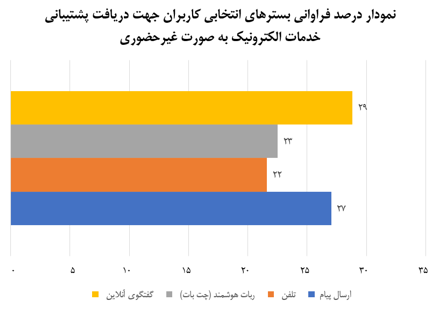 براساس سوال "کدام یک از بسترهای ارتباطی جهت دریافت پشتیبانی از خدمات سازمان تبلیغات اسلامی را مناسب و کاربرپسند میدانید؟" متقاضیان دریافت خدمات الکترونیک سازمان بسترهای متفاوتی جهت دریافت پشتیبانی خدمات الکترونیک به صورت غیرحضوری را مدنظر دارند. در این میان با در نظر گرفتن توسعه ارتباطات برخط، درصد تمایل کاربران به استفاده از پشتیبانیهای برخط (گفتگوی آنلاین و ربات هوشمند) قابل تأمل است. همچنین آمار ذیل نشان میدهد کمترین تمایل نسبت به دریافت پشتیبانی از بستر تلفن میباشد که ضرورت توسعه بسترهای پشتیبانی برخط را نمایان میسازد.