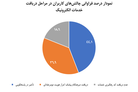 آمار حاصل از پاسخ سوال "با کدام یک از چالشهای زیر در مراحل دریافت خدمات بیشتر مواجه بودید؟" نمایانگر تمایل کاربران و متقاضیان خدمات به دریافت هرچه سریعتر نتایج درخواستهای خود میباشد. این آمار نشان میدهد که توسعه خدمات الکترونیکی به صورت هوشمند ضرورتی اجتنابناپذیر برای کاهش میزان زمان انتظار کاربران است. هوشمندسازی خدمات این امکان را مهیا میکند تا درخواست خدمات بدون دخالت نیروی انسانی دریافت و نتیجه مربوطه به آنها ارائه شود که این مهم در ارزیابی نهادهای نظارتی به صورت مستمر مورد تأکید و پایش قرار دارد.