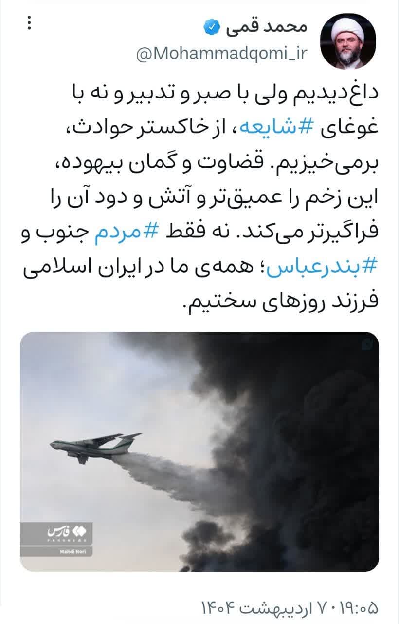 به گزارش روابط عمومی سازمان تبلیغات اسلامی، حجتالاسلم محمد قمی، رئیس سازمان تبلیغات اسلامی در واکنش به وقایع رخ داده در بندر شهید رجایی و جان باختن جمعی از هموطنان در صفحه شخصی خود در شبکه ویراستی متنی منتشر کرد.