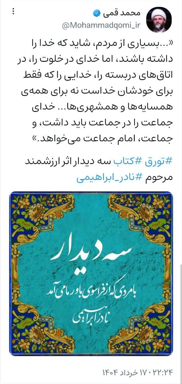 ۱۷ خرداد | حجتالاسلام قمی در صفحه شخصی خود نوشت؛