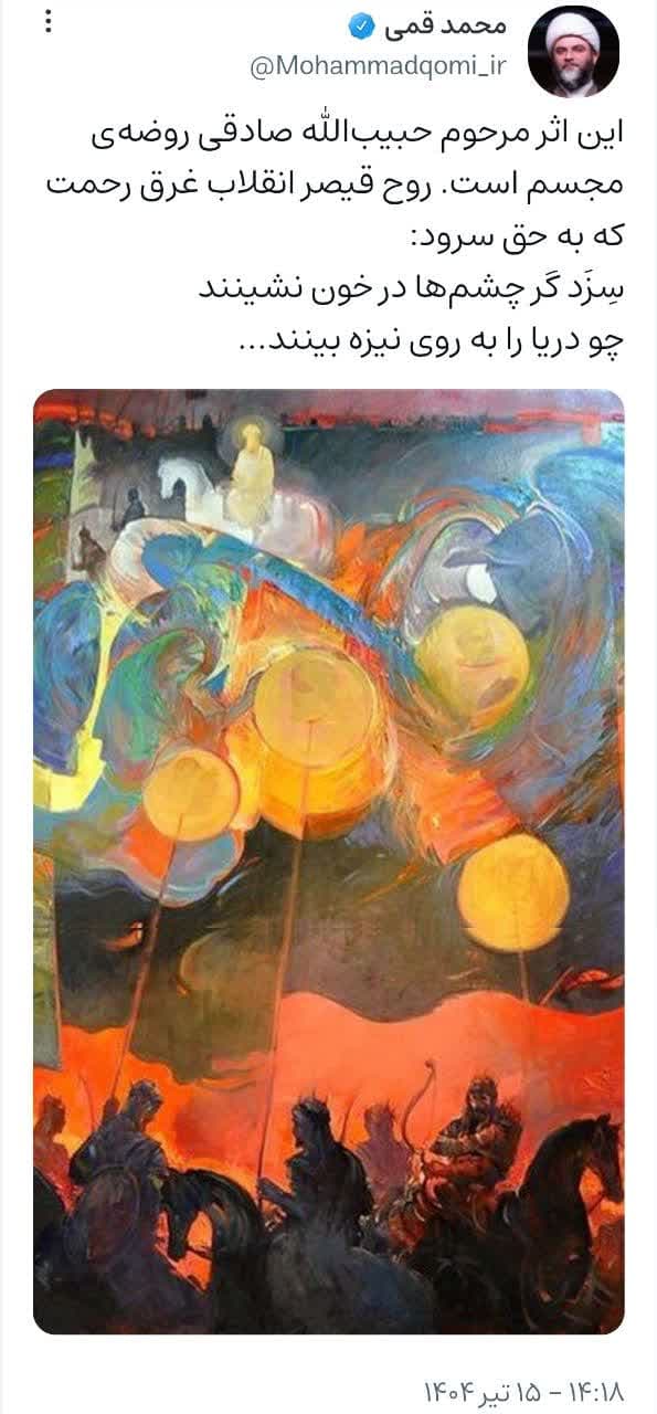 به گزارش روابط عمومی سازمان تبلغیات اسلامی، حجتالاسلام محمد قمی، رئیس سازمان تبلیغات اسلامی در روز عاشورا با انتشار اثر عاشورایی مرحوم «حبیبالله صادقی» و با اشاره به ابیاتی از مرحوم «قیصر امینپور»، دو چهرهی فقید هنر انقلاب نوشت؛