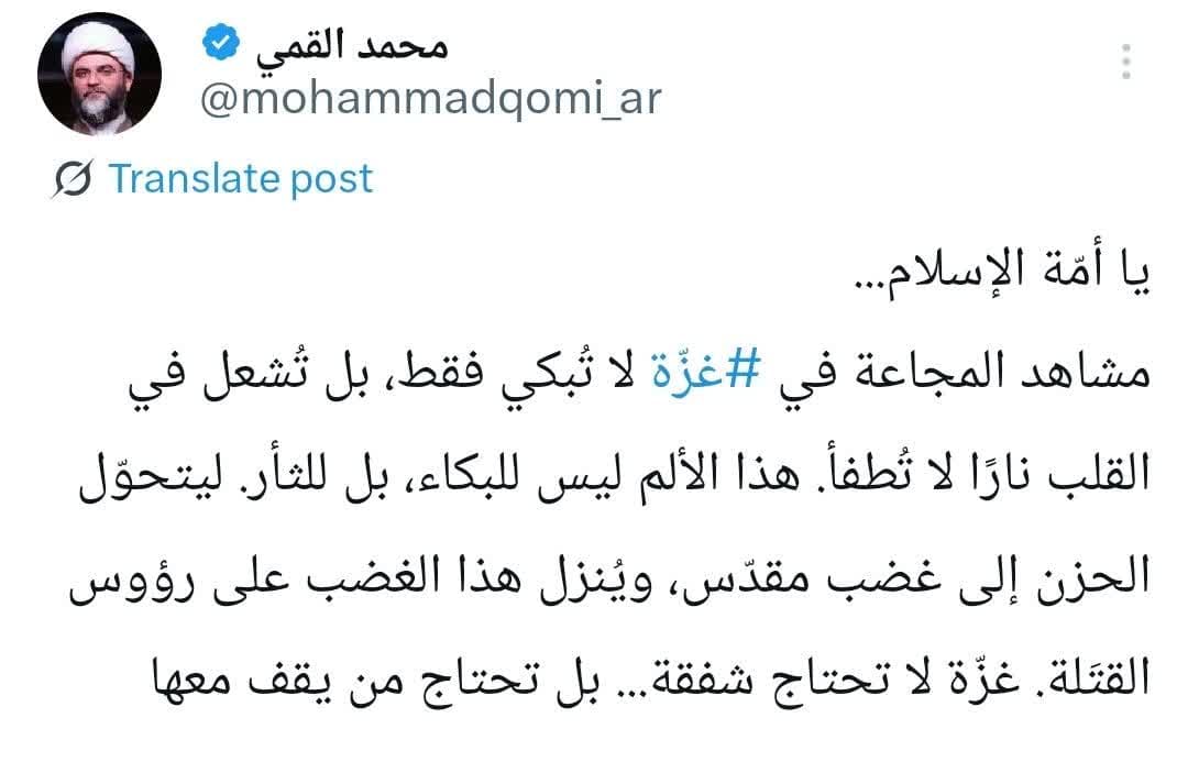 ۱۱ مرداد | پیام عربی حجتالاسلام قمی در شبکه ایکس