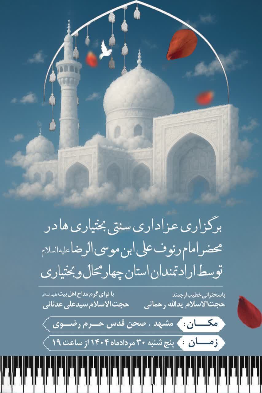 وی گفت: عزاداری سنتی بختیاریهای چهارمحال و بختیاری در حرم مطهر رضوی هر ساله در ۲ نوبت در ماههای محرم و صفر برگزار میشود که نوبت اول این برنامه در شب هفتم محرم با شکوه خاصی برگزار شد و نوبت دوم نیز ویژه ایام پایانی صفر فردا شب برگزار میشود.