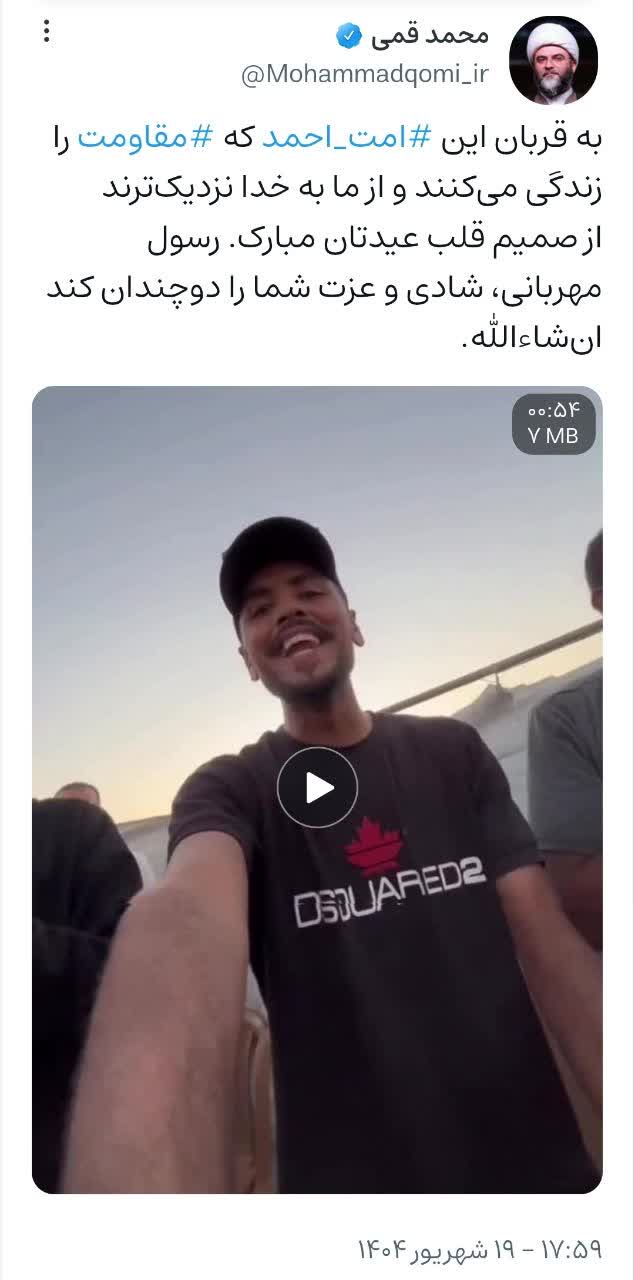 به قربان این امت احمد که مقاومت را زندگی میکنند و از ما به خدا نزدیکترند. از صمیم قلب عیدتان مبارک. رسول مهربانی، شادی و عزت شما را دو چندان کند انشاءالله.