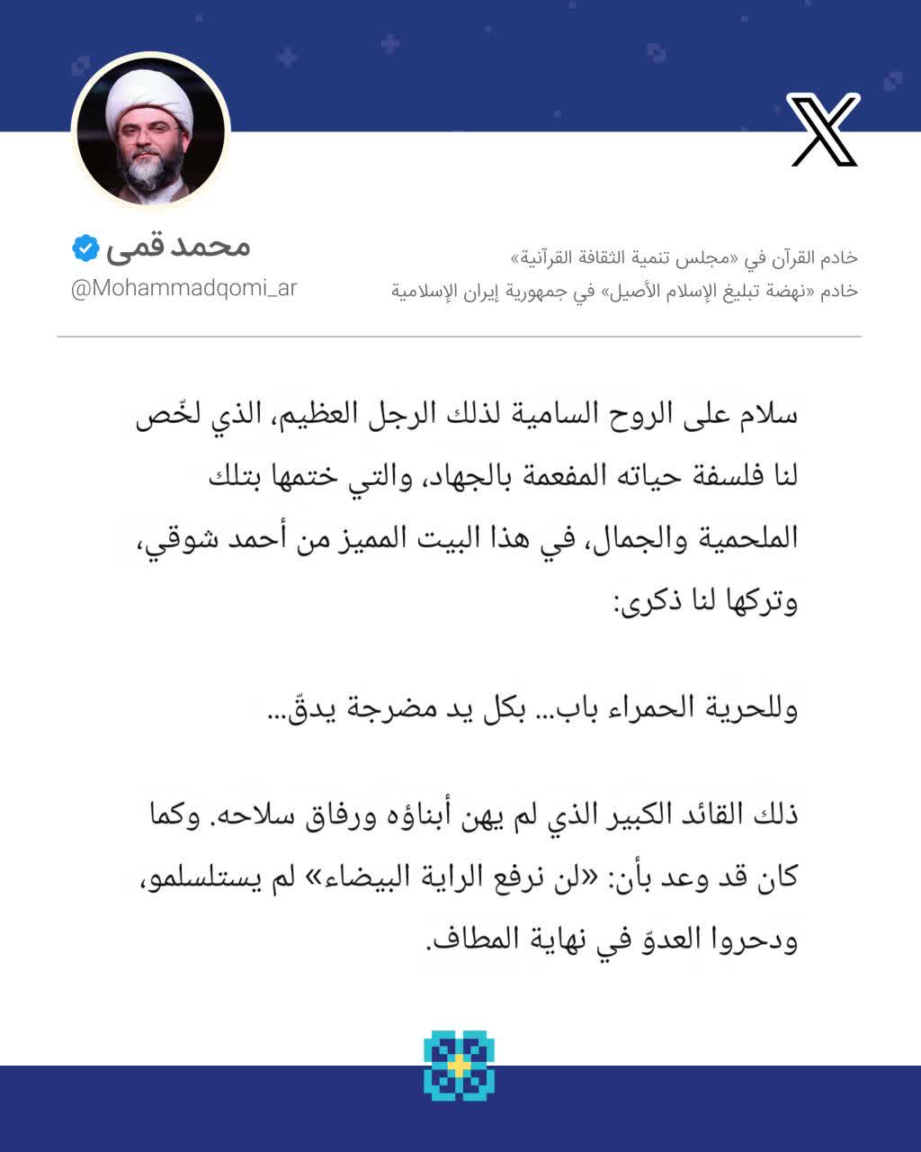 به گزارش روابط عمومی سازمان تبلیغات اسلامی، حجتالاسلام محمد قمی، رئیس سازمان تبلیغات اسلامی در سالروز شهادت یحیی سنوار در صفحه شخصی خود در شبکه اجتماعی ویراستی نوشت؛