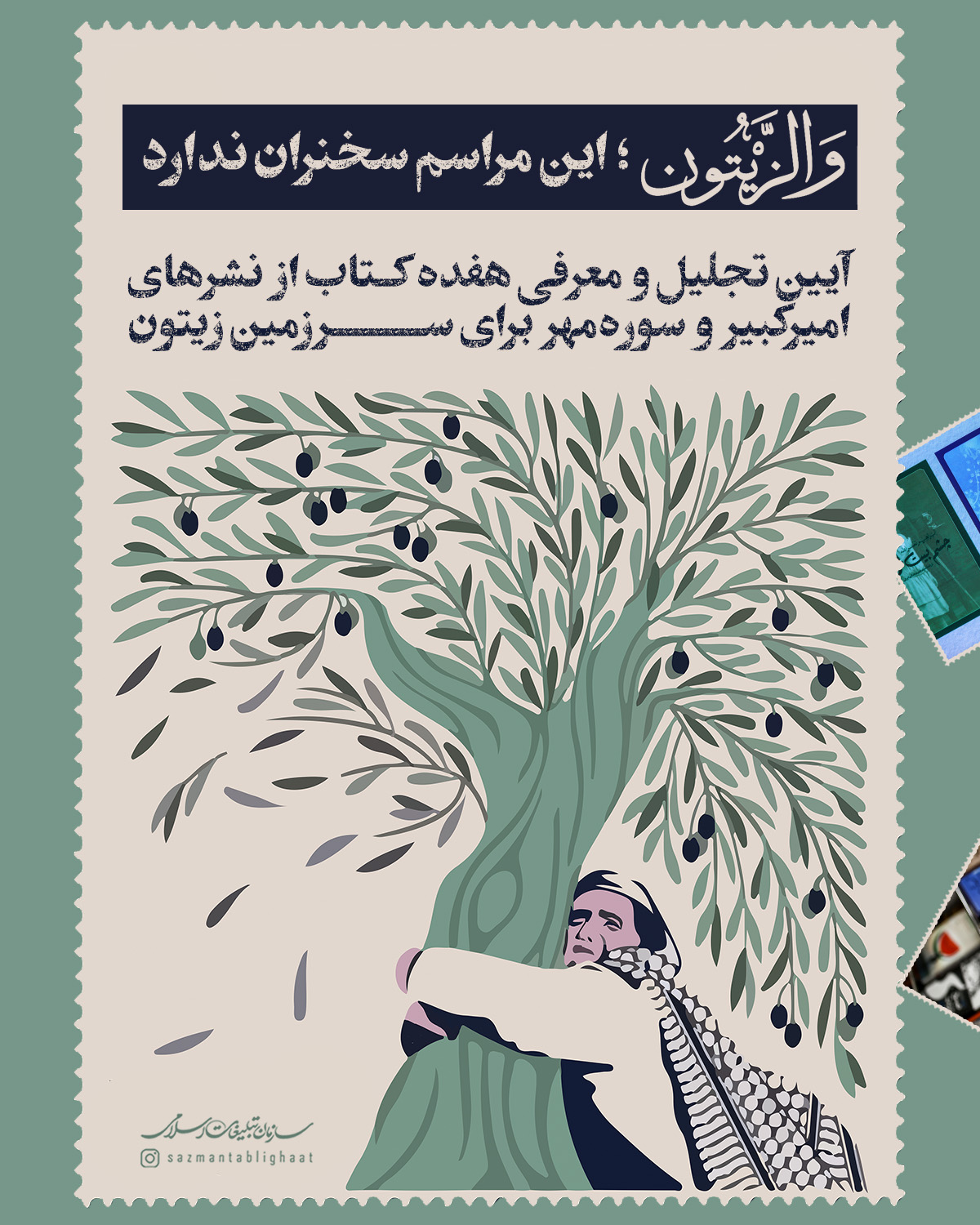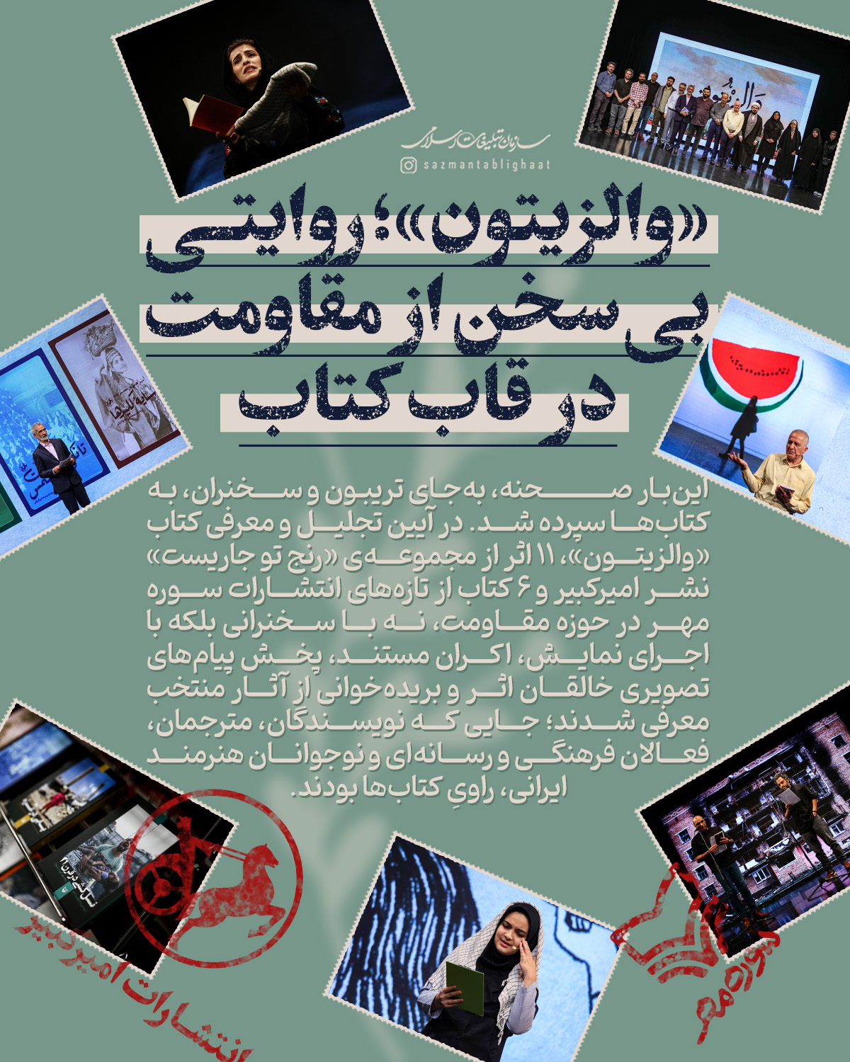 به گزارش روابط عمومی سازمان تبلیغات اسلامی، در آیین تجلیل و معرفی کتاب «والزیتون»، ۱۱ اثر از مجموعهی «رنج تو جاریست» نشر امیرکبیر و ۶ کتاب از تازههای انتشارات سورهمهر در حوزه مقاومت، نه با سخنرانی بلکه با اجرای نمایش، اکران مستند، پخش پیامهای تصویری خالقان اثر و بریدهخوانی از آثار منتخب معرفی شدند؛ جایی که نویسندگان، مترجمان، فعالان فرهنگی و رسانهای و نوجوانان هنرمند ایرانی، راویِ کتابها بودند.