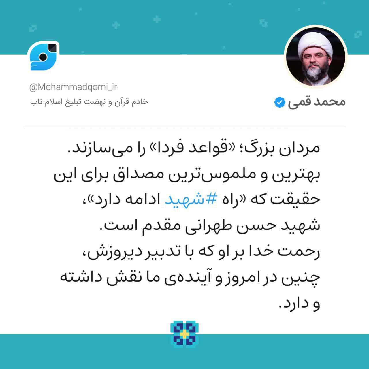 به گزارش روابط عمومی سازمان تبلیغات اسلامی، حجتالاسلام محمد قمی، رئیس سازمان تبلیغات اسلامی در سالگرد شهادت شهید طهرانی مقدم، پدر موشکی ایران در صفحه شخصی خود در شبکه اجتماعی ویراستی نوشت؛